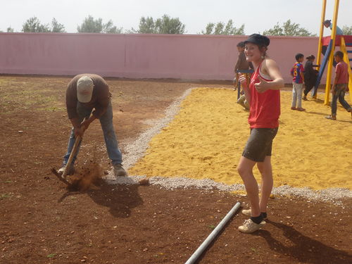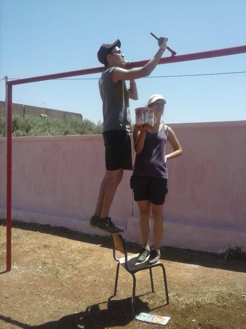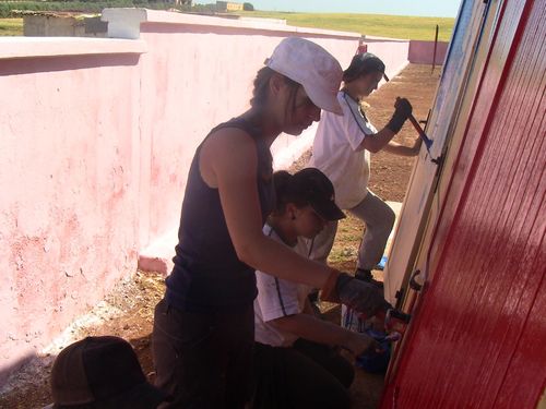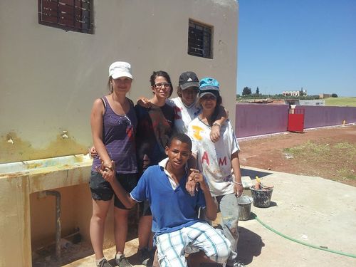 Aujourd'hui, nous nous sommes attaqués au mur qui encercle l'école. Nous avons rebouché les trous , puis nous avons recouvert le mur d'une peinture blanchâtre. Une journée très fatigante à cause du soleil qui tapait plus fort que les jours précédents. Le soir, nous nous sommes rendus à la protection sociale de l'enfance où le directeur nous a fait visiter les lieux. Nous avons également partagé des chants autour d'un thé et de gâteaux marocains. Encore une bonne journée et une ambiance marocaine toujours au rendez-vous.