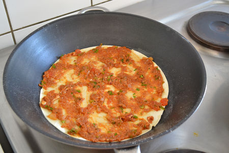 Faire 8 boules avec la pâte et former des pizzas à l’aide d’un rouleau et les garnir avec la préparation.