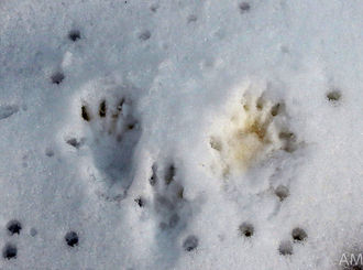En y regardant de plus près, la terre gorgée d'eau et la neige révèlent les traces du passage des animaux : des plus gros, le sanglier ou le chevreuil, aux plus légers, oiseaux, belettes ou lapin.